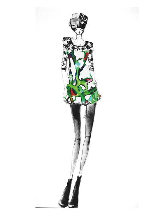 Meine entworfenen Muster waren auf mehreren Modenschauen der Meisterschule für Mode in München zu sehen. Die Muster wurden mit Aquarell erst auf dem Blatt entworfen und dann digitalisiert und rapportfähig gemacht.